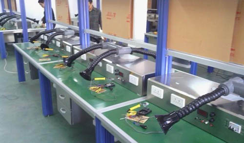 | 外排和室內(nèi)凈化簡(jiǎn)述: (1):外排方式: 整體布管根據(jù)實(shí)際情況使用不同的風(fēng)機(jī),通過(guò)分次布管接到各個(gè)焊錫工位,通常主管直徑在30CM左右,分到次管直徑為5CM到10CM之間,前面也需要加上喇叭口之類(lèi)的吸煙罩以達(dá)到更好的吸煙效果,風(fēng)機(jī)功率在7.5千瓦左右。一個(gè)7.5千瓦風(fēng)機(jī)能帶上20個(gè)左右焊錫工位![煙霧凈化器] (2):通過(guò)煙霧凈化設(shè)備凈化后直接在室內(nèi)排放: 采用煙霧凈化設(shè)備直接將煙霧廢氣完整的吸過(guò)來(lái),經(jīng)過(guò)凈化處理達(dá)室內(nèi)空氣質(zhì)量標(biāo)準(zhǔn),可直接在室內(nèi)排放。