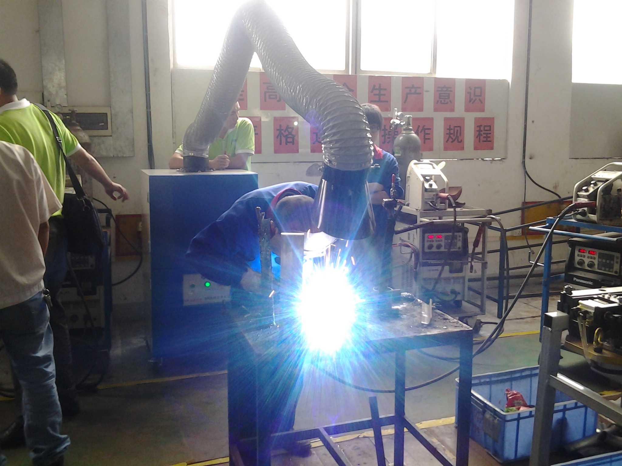 | 工業生產中,在鋼鐵、特種金屬等重工業場合,切割、燒焊、熔接等作業是不可缺少的重要工序,但在作業過程中會產生大量煙塵,而這些煙塵包含各種有毒物質,例如臭氧、氮氧化物、碳氫化合物、一氧化碳等,這些有毒物質會對人體帶來極大傷害。 焊接煙塵的產生過程,是在高溫電弧情況下,焊條端部及其母材相應被熔化,熔液表面劇烈噴射由藥皮焊芯產生的高溫高壓蒸汽 (蒸汽壓達66~13158Pa)并向四周擴散。當蒸汽進入周圍的空氣中時,被冷卻并氧化,部分凝結成固體微粒,這種由氣體和固體微粒組成的混合物,就是所謂的焊接煙塵。 焊接煙氣中的煙塵是一種非常復雜的物質,已在煙塵中發現的元素多達20種以上,其中含量最多的是Fe、Ca、Na等,其次是Si、Al、Mn、Ti、Cu等。焊接煙塵中的主要有害物質為Fe2O3、SiO2、MnO、HF等,其中含量最多的為Fe2O3,一般占煙塵總量的35.56%,其次是SiO2,其含量占10~20%,MnO占5~20%左右。焊接煙氣中有毒有害氣體的成份主要為CO、CO2、O3、NOX、CH4等,其中以CO所占的比例最大。這些有毒物質正嚴重的吞噬人類的健康。導致許多職業病的出現。如:肺癌、哮喘、濕疹、支氣管炎、皮膚過敏、呼吸道感染等等,重則紊亂中樞神經,破壞消化系統,導致并發癥而衰竭死亡。 申瑞生產的焊接煙塵凈化器主要應用在焊接工位,凈化焊接、拋光、切割、打磨等工序中產生的煙塵粉塵,以及回收稀有金屬和貴重物料。凈化效率高,噪聲低、使用靈活、占地面積小。